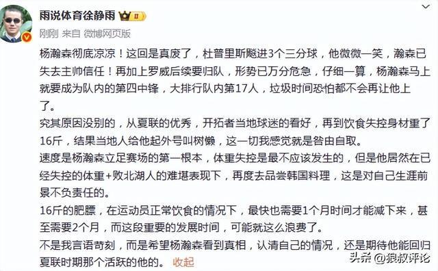值得一提的是上一场湖人和开拓者的赛后,徐静雨在社媒与球迷互动当中提到杨瀚森表现不佳,以及吃宵夜的话题表示:又去吃啊,那基本完了,等着回来吧。别再乱吃了!赶紧练吧!不如当初周琦等言论一度引发外界的热议,特别是不少球迷在各大媒体转发和带节奏。
